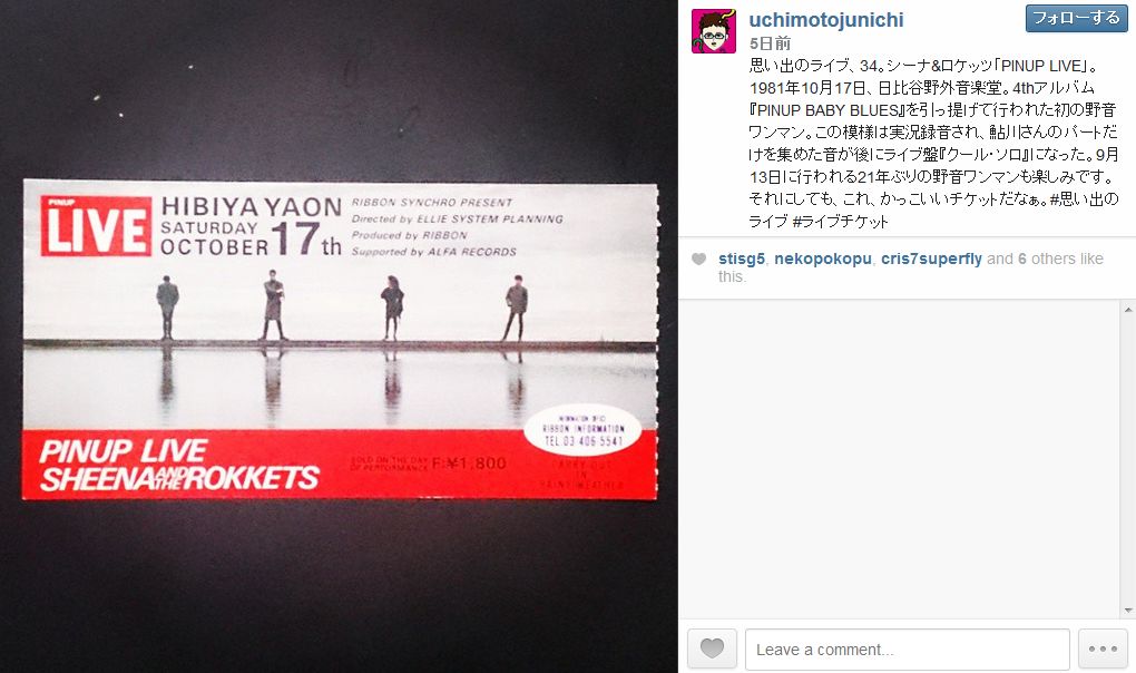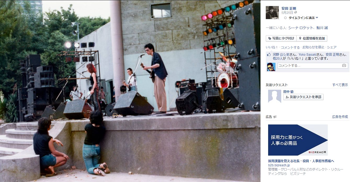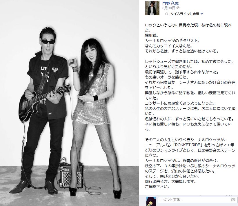 みなさんのシナロケの野音の写真とか思い出をロケットウェブか鮎川のフェイスブック、シーナのフェイスブックへどしどし投稿してください!待ってます!!