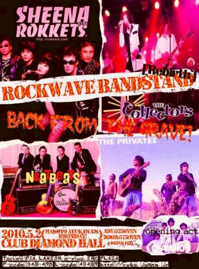 公演日 : 2008年05月25日(日) 会場 : 愛知県 名古屋CLUB DIAMOND HALL OPEN/SHOW : 16:00/16:30 出演 : SHEENA & THE ROKKETS、THE COLLECTORS、 ROCK'N'ROLL GYPSIES、THE PRIVATES、DARKSIDE MIRRORS 料金:前売 5250円 / 当日 5500円(ドリンク代別途必要) 問い合わせ先 クラブダイアモンドホール:052-265-2665 SMCプラザ:052-265-2666 【注意事項】スタンディング:スタンディングは、整理番号付・別途ドリンク代必要。 一般発売:2008年3月21日(金) チケットぴあ 0570-02-9999 (Pコード:286-678) ローソンチケット 0570-000-777(Lコード:46660) イープラス SMCプラザ、モダンワールド店頭にて発売開始。 | ![]() |